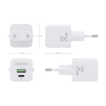 Chargeur Gan Aisens 25W - 1xUSB-C PD3.0 QC4.0 - 1xUSB-A QC3.0 - Couleur blanche